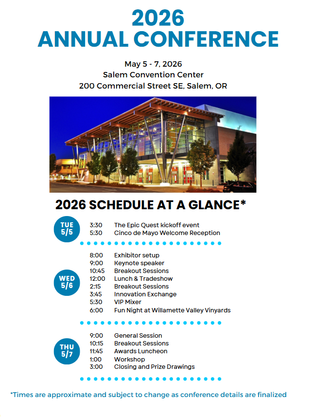 We are excited to announce that our 2026 Annual Conference & Expo is taking place at the Salem Convention Center, located in downtown Salem, Oregon. The Convention Center offers impeccable service, superb cuisine, full hotel service, and an on-site restaurant. It's the perfect central Willamette Valley location for everyone to meet. Learn More about the Convention Center.